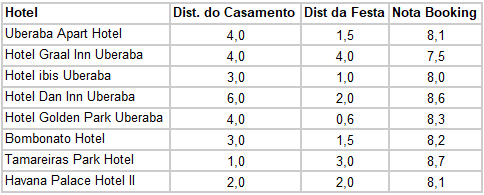 Para o seu conforto, selecionamos algumas sugestões de hospedagem organizadas por custo-benefício, com as respectivas distâncias para a cerimônia e a recepção. Recomendamos realizar sua reserva com antecedência, pois haverá outro evento na cidade na mesma data. Além dos hotéis, plataformas como o Airbnb oferecem excelentes opções de locação.